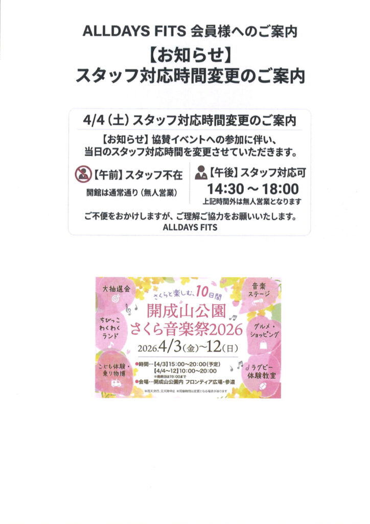 News ニュース 2026.03.27 ニュース 4月4日のスタッフ対応時間について いつもALLDAYSFITSをご利用頂き誠にありがとうございます。 4月4日(土)スタッフ対応時間変更のお知らせ 4月4日(土) 協賛イベントへの参加に伴い、当日のスタッフ対応時間を変更させていただきます。 ・【午前】 スタッフ不在 開館は通常通り(無人営業) ・【午後】 スタッフ対応可 14:30~18:00 上記時間以外は無人営業となります ご不便をおかけしますが、ご理解ご協力をお願いいたします。